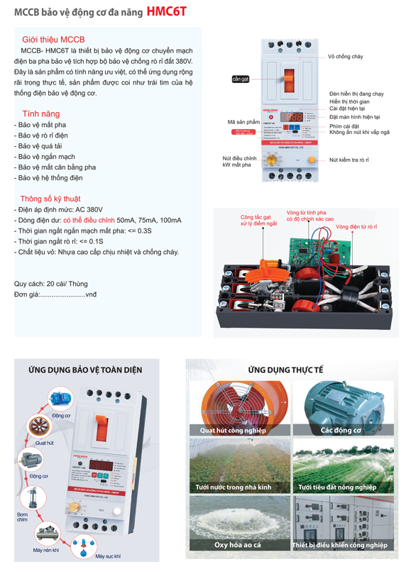 MCCB- HMC6T là thiết bị bảo vệ động cơ chuyển mạch điện ba pha bảo vệ tích hợp bộ bảo vệ chống rò rỉ đất 380V. Đây là sản phẩm có tính năng ưu việt, có thể ứng dụng rộng rãi trong thực tế, sản phẩm được coi như trái tim của hệ thống điện bảo vệ động cơ.