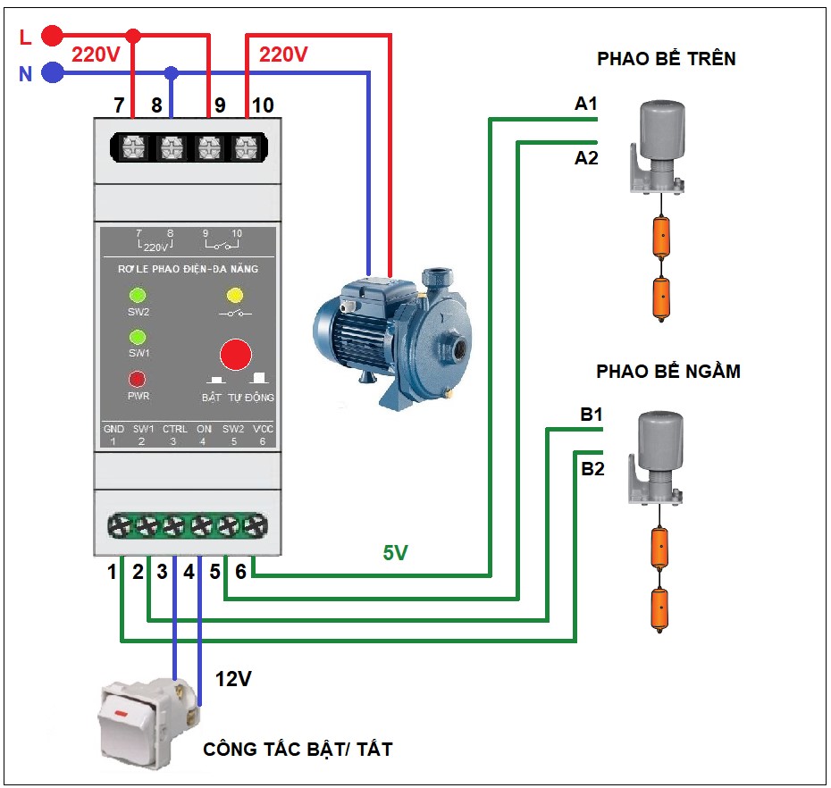 - Tăng tuổi thọ phao điện do phao điện không phải trực tiếp chịu tải đóng cắt nguồn điện 220V đến máy bơm.