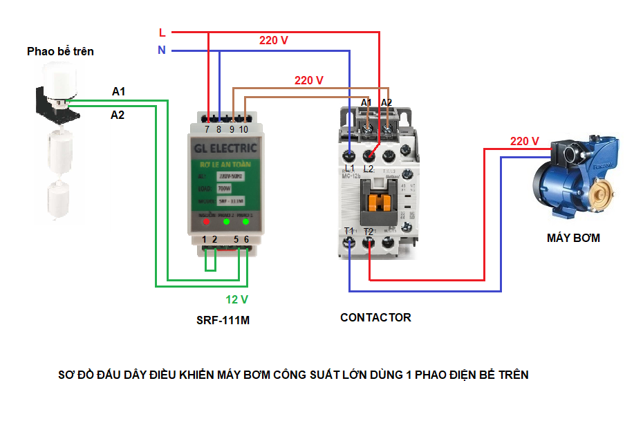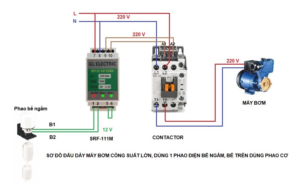 Trường hợp máy bơm công suất lớn hơn 1200W, sử dụng Rơ le an toàn cho phao điện SRF-111M kết hợp với Contactor (khởi động từ)