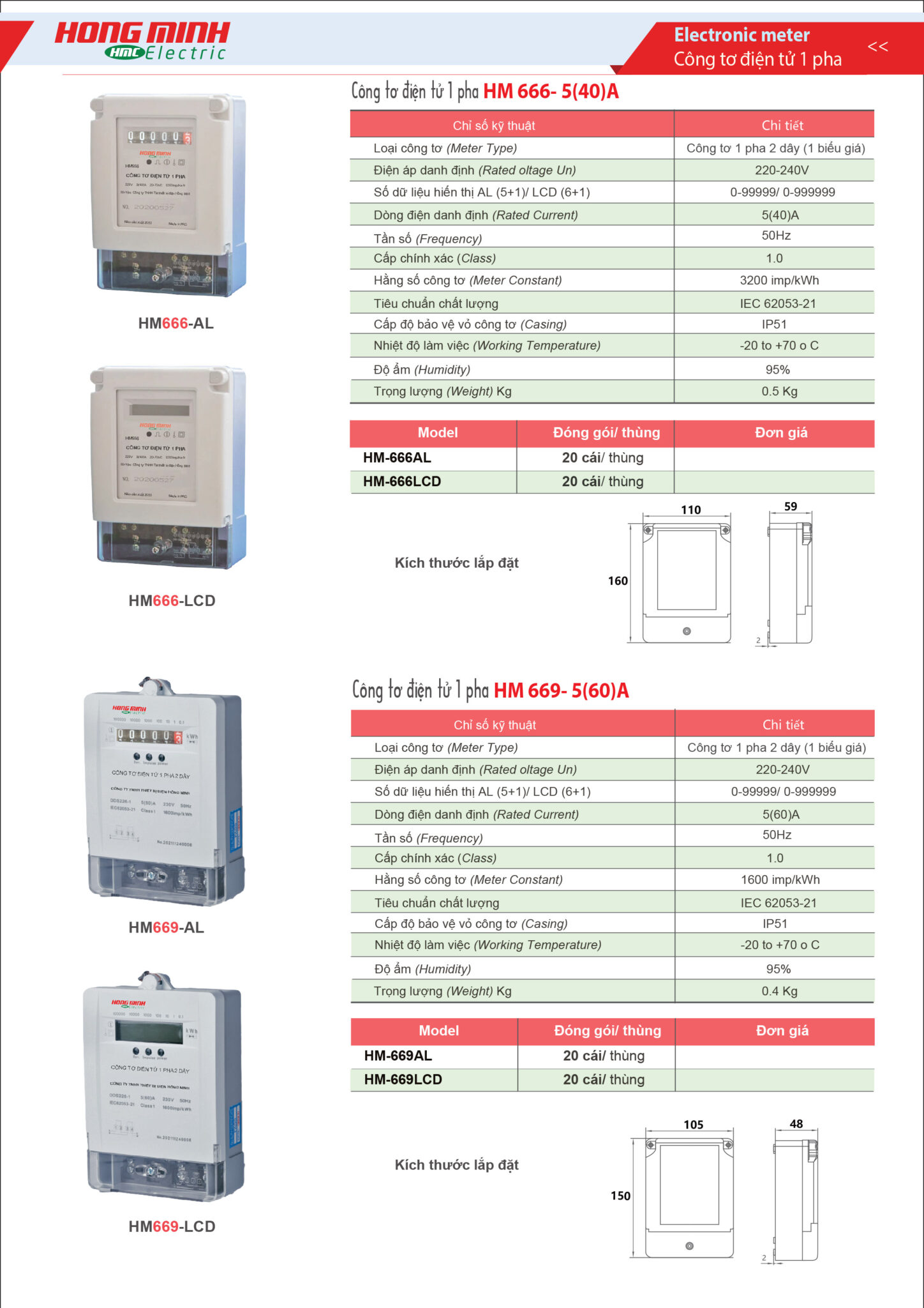 Sản phẩm công tơ điện hiệu HONG MINH Electric được sản xuất phù hợp theo tiêu chuẩn kỹ thuật IEC62053-21 và IEC 62052- 11, tiêu chuẩn đo lường hiện hành Việt Nam. Các sản phẩm có ưu điểm là tuổi thọ cao, độ chính xác cấp 1, bền và ổn định, khả năng vượt tải cao, ít tiêu hao điện năng và kích thước nhẹ nhỏ gọn.