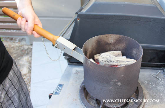 1. Place charcoal in a charcoal chimney (pot with holes in the bottom) or directly over naked flame (Example: on a portable gas burner) to ignite for approx 25 minutes. It should be consistently glowing. Do not use a synthetic fire starter or you will end up with unhealthy and distasteful chemical fumes.