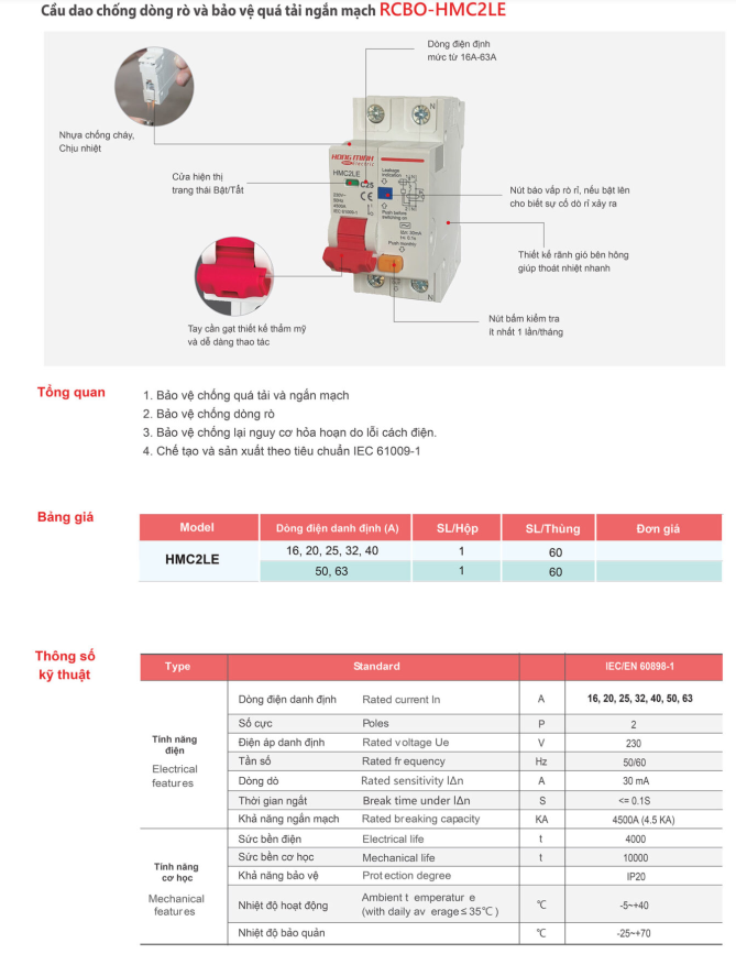 RCBO CHỐNG DÒNG RÒ VÀ BẢO VỆ QUÁ TẢI -HMC2LE